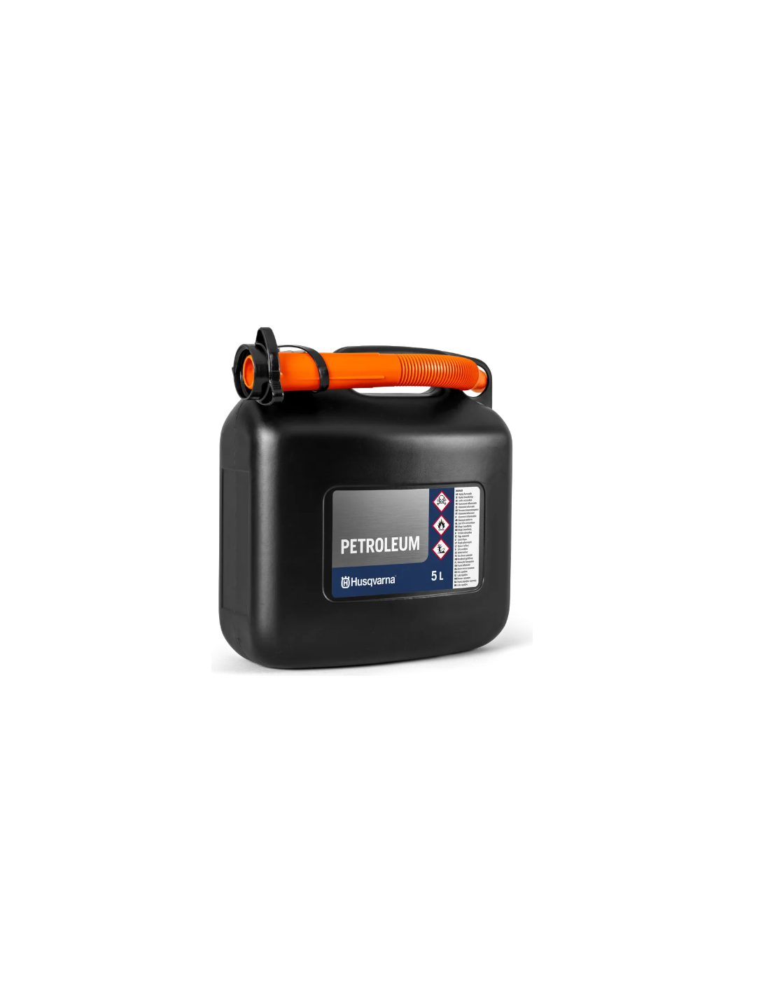 Tanica di carburante Husqvarna da 5 litri, con maniglia integrata per il trasporto facilitato. È dotata di beccuccio flessibile per un riempimento senza problemi e con un rischio ridotto di fuoriuscite accidentali.